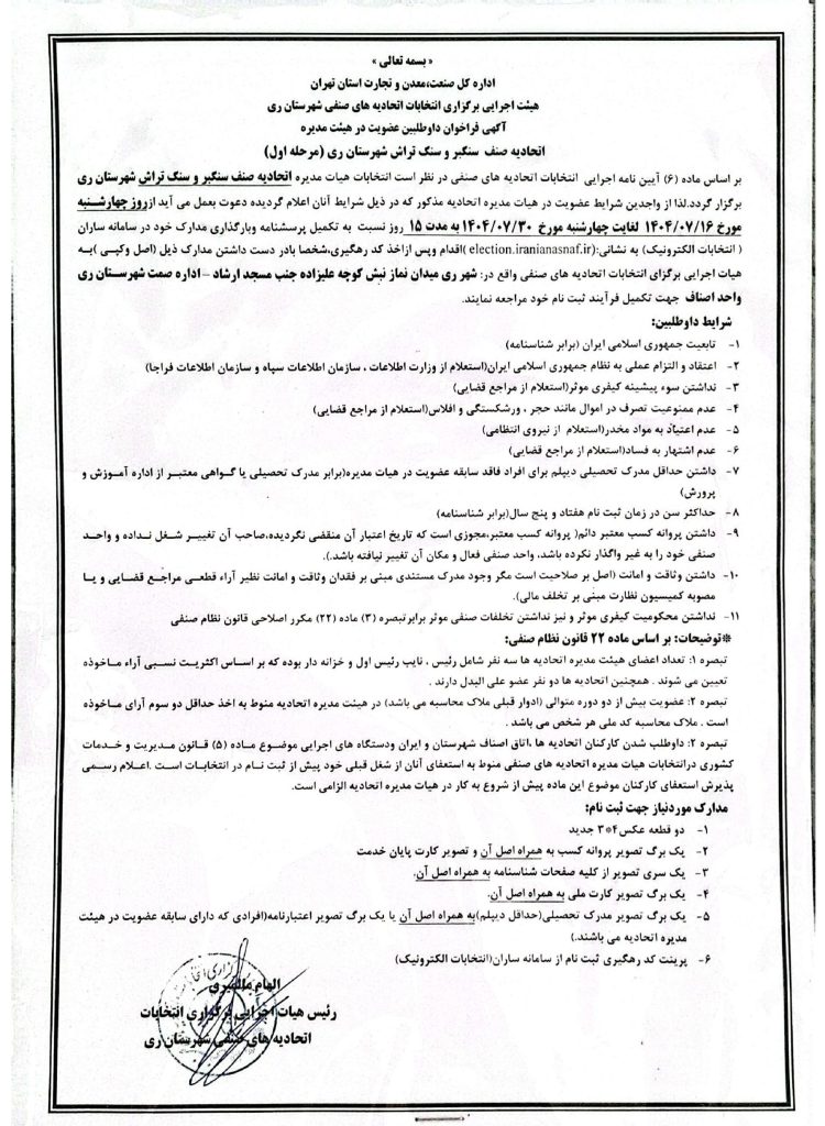 آگهی فراخوان داوطلبین عضویت در هیات مدیره اتحادیه صنف سنگبر و سنگ تراش شهرستان ری